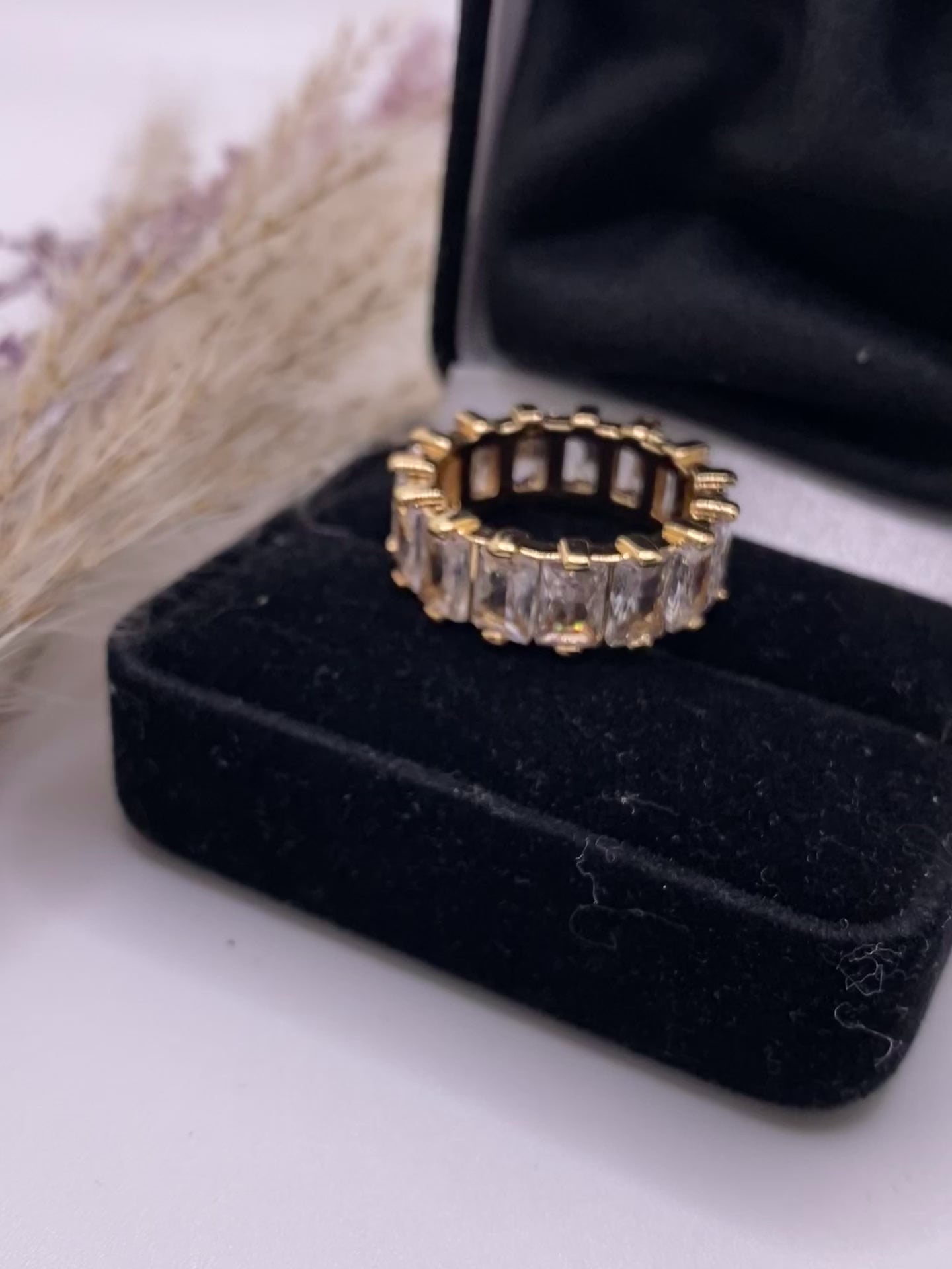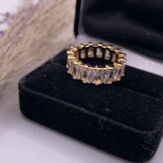 - This exquisite ring features a dazzling array of rectangular diamond gems set in a sleek and modern design.